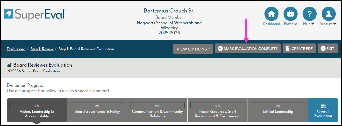 - As the Board President (or Trusted Agent), navigate back to the Dashboard and click Mark Complete to move onto Step 2 and compile all evaluations