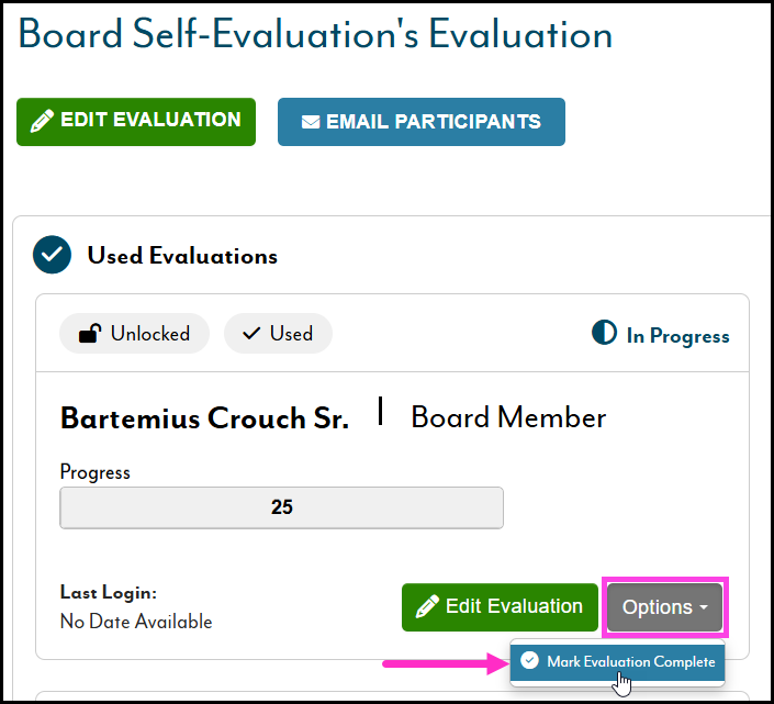Alternatively, navigate back to Step 1: Review, click the Options button, and select Mark Evaluation Complete