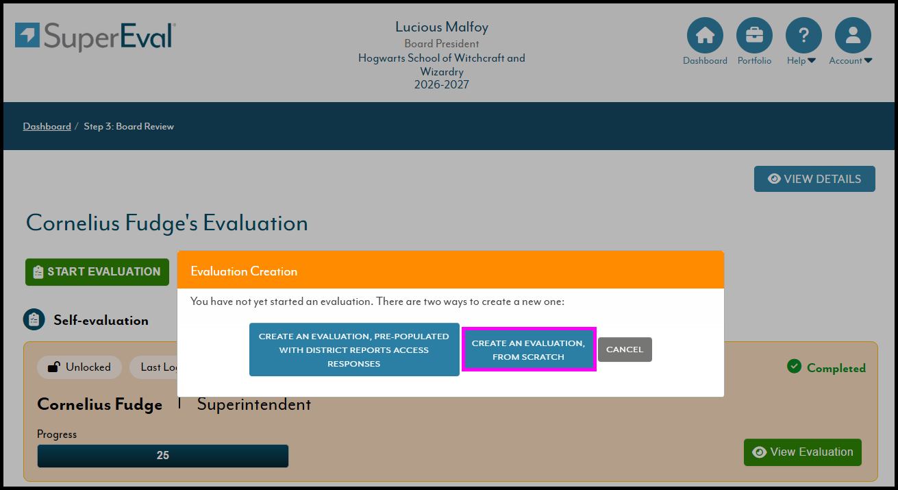 - Choose to start your evaluation from a blank form or to have the evaluation automatically pre-populated with the superintendent’s responses