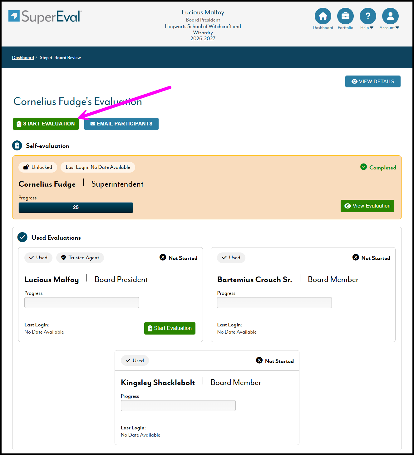 - Click on the green START EVALUATION button to begin your evaluation of the superintendent