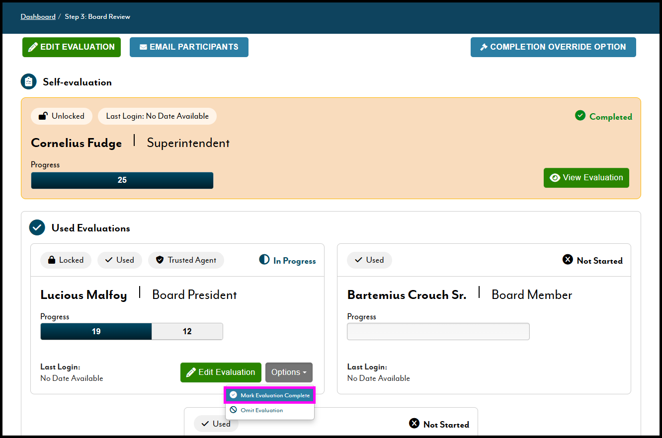 - As the Board President (or Trusted Agent), click Mark Complete to move onto Step 4 and compile all evaluations