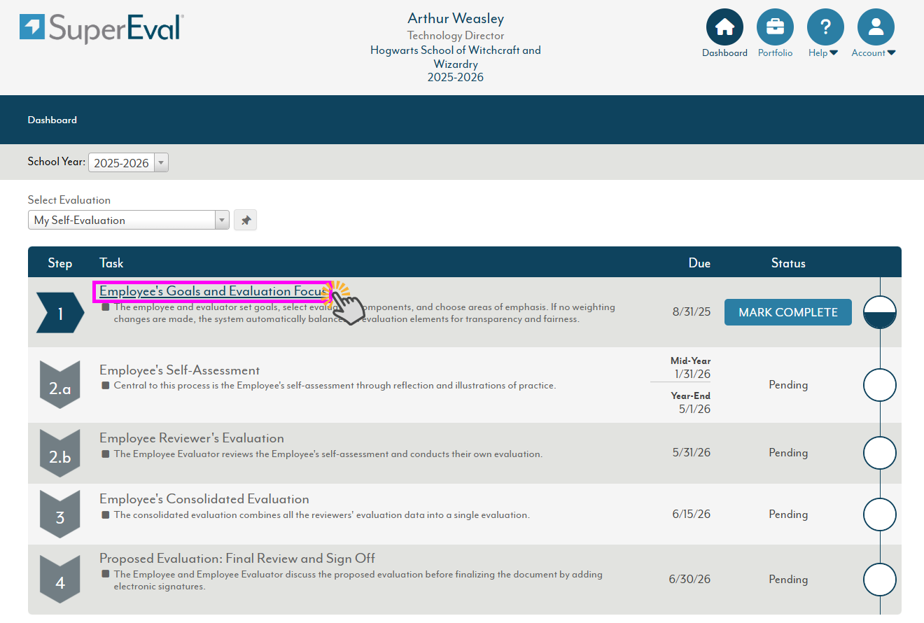 After you enter your goals into Super Eval and the competencies have been selected, it is time to align these competencies to your goals. This is done inside step 1, on the same screen where you enter the goals. To get there, click on Step 1 from your Dashboard.
