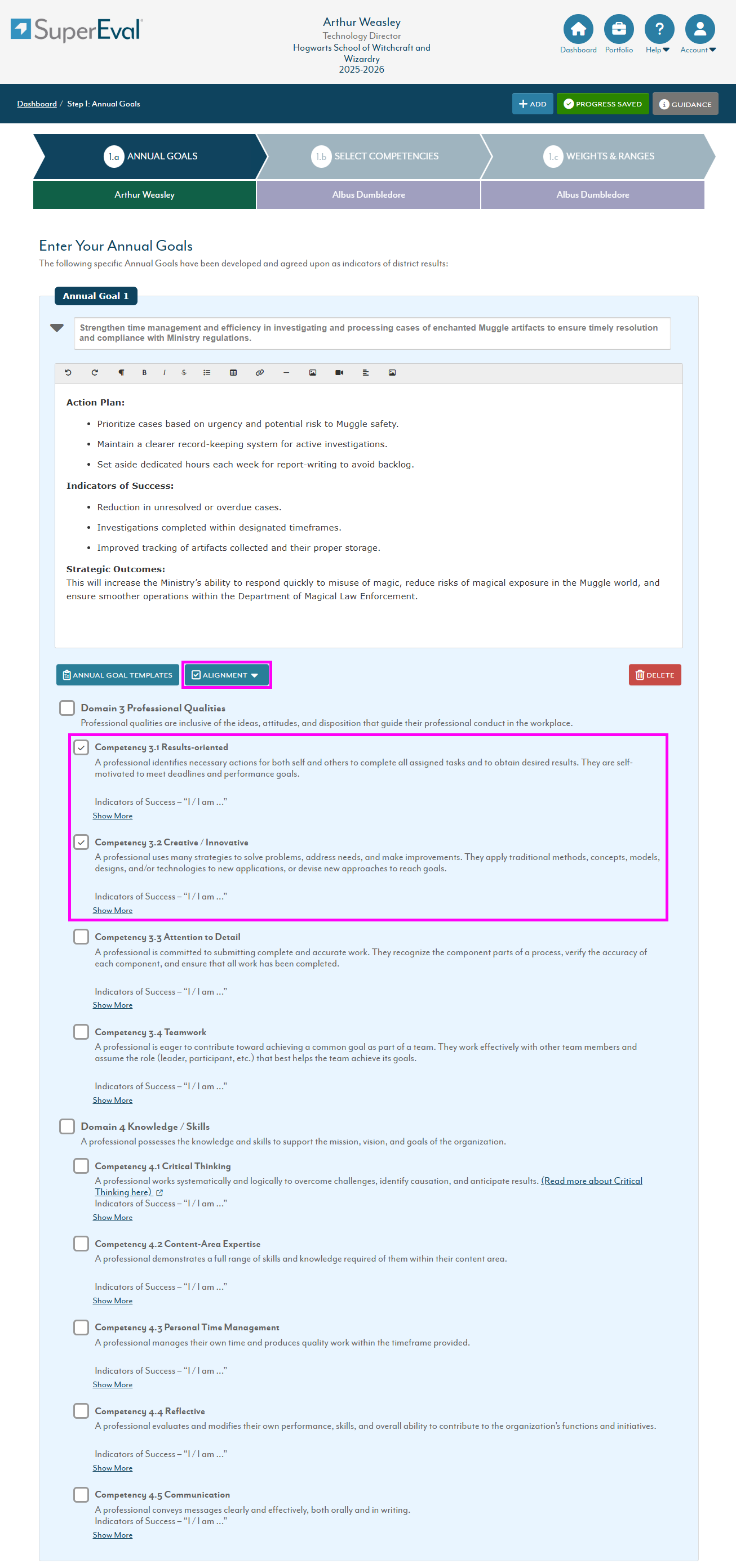 Scroll down below the text box where you drafted your goals and press the Alignment button, then check the box for each competency that aligns with this goal. You can select entire domains at once, as well. Repeat this for each of your goals.