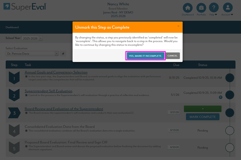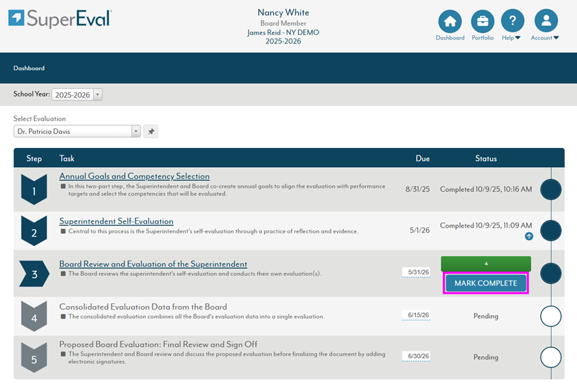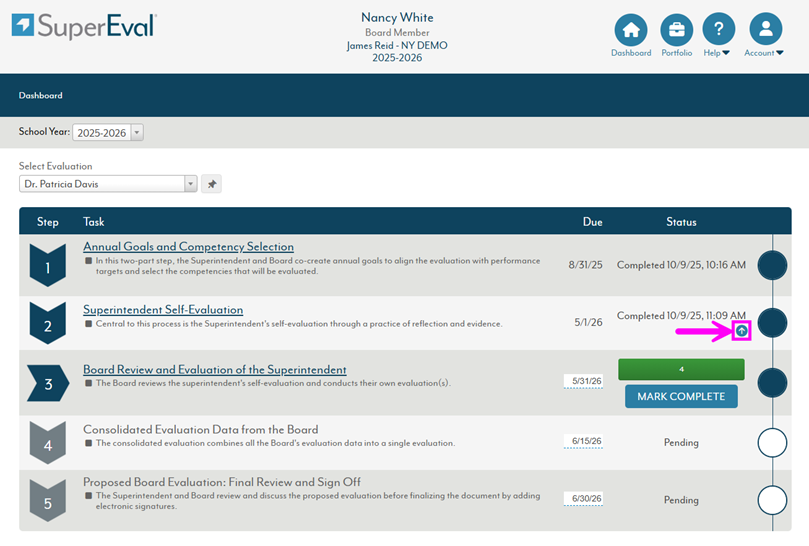 Trusted Agents are the users that Mark Steps complete and advance group evaluations like the Superintendent evaluation, and the Board of Education self-evaluation.