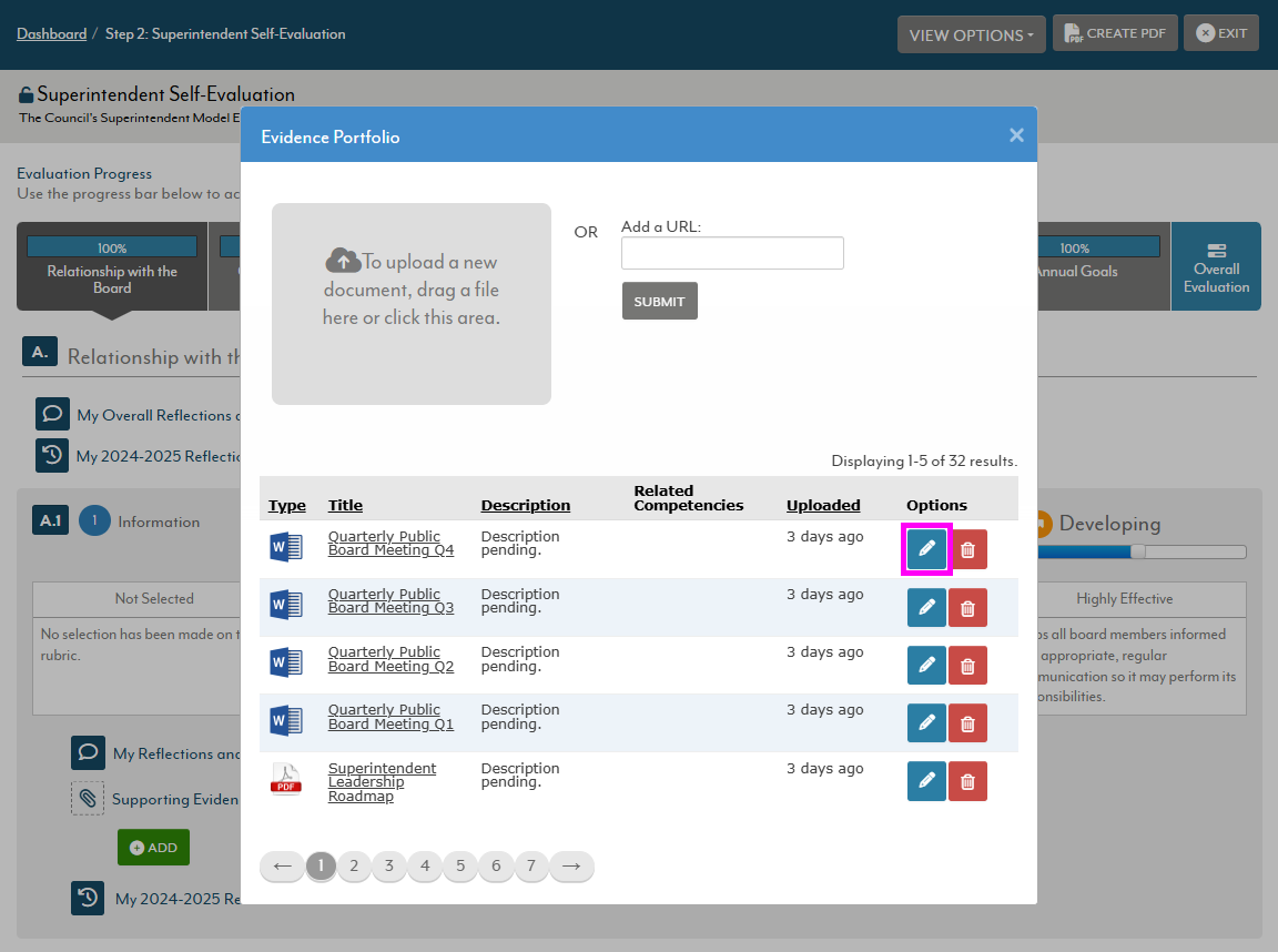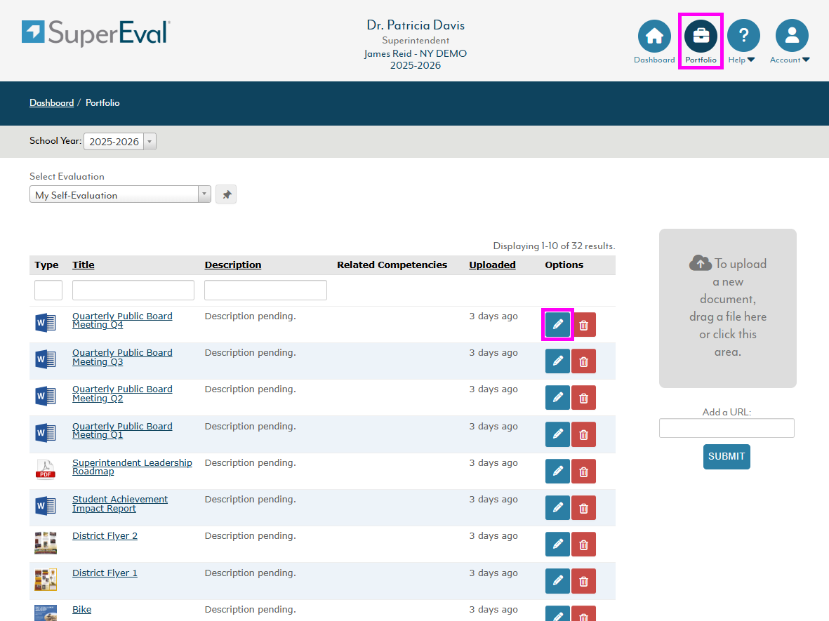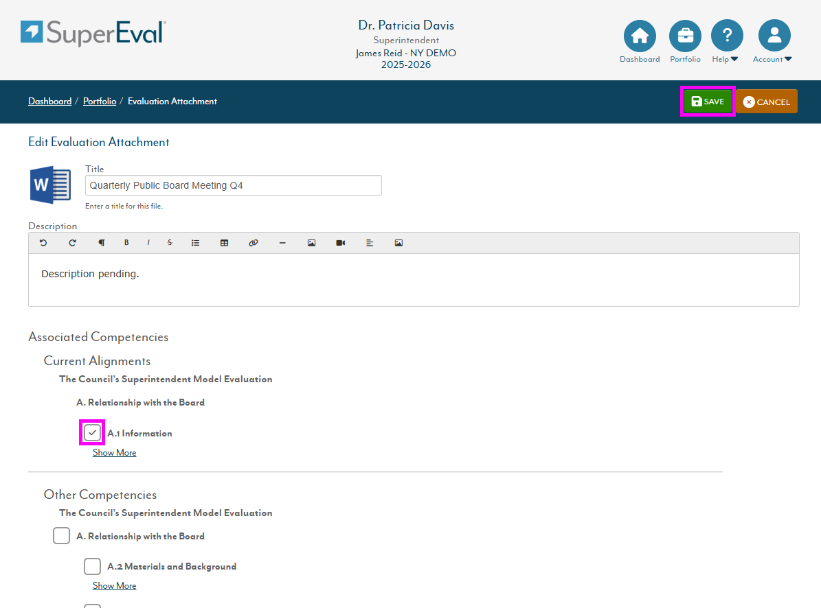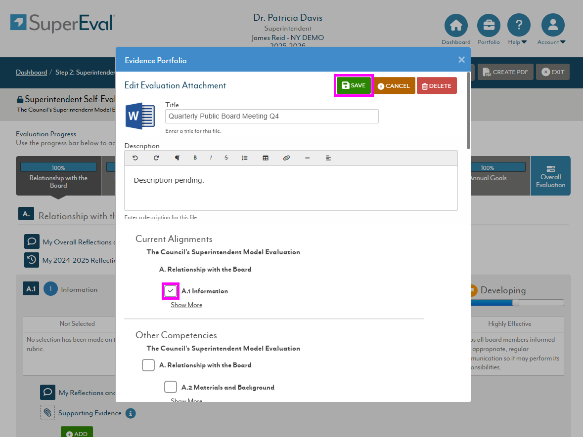 Many SuperEval users will upload files into their portfolio, as they receive them for use later in the evaluation process. Others have evidence files uploaded to their Portfolio by an assistant, for their convenience, so they can stay digitally organized and ensure that their achievements and accomplishments are properly represented on their evaluation.  Once these evidence files are uploaded, they will need to be assigned to competencies.  Using previously uploaded evidence allows you to quickly connect existing files to your evaluation goals and components. There are two methods you can use to assign your evidence files: