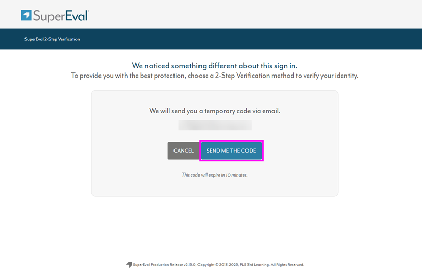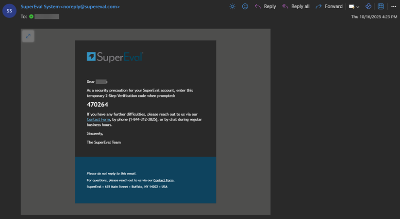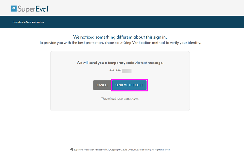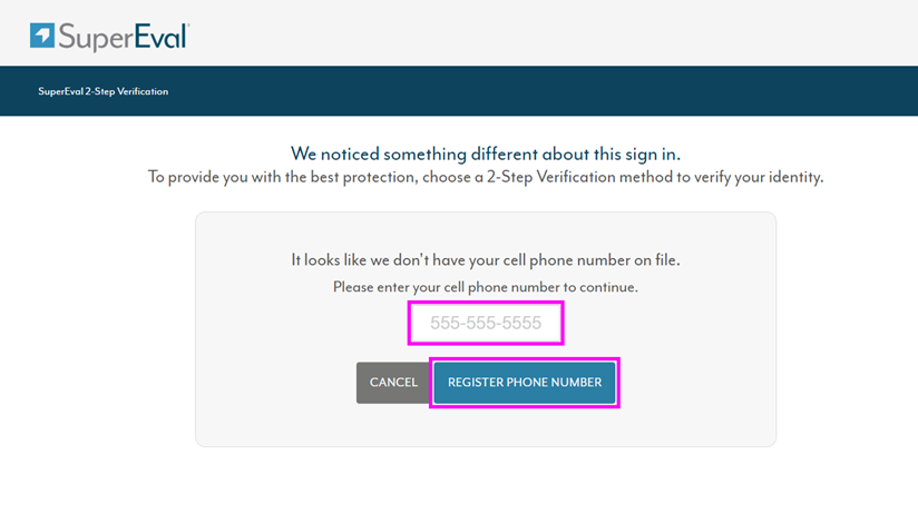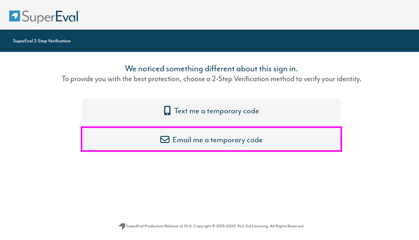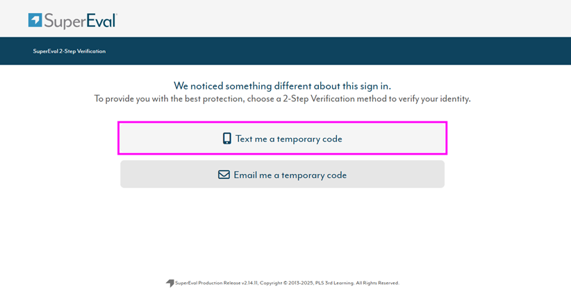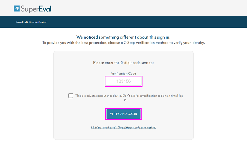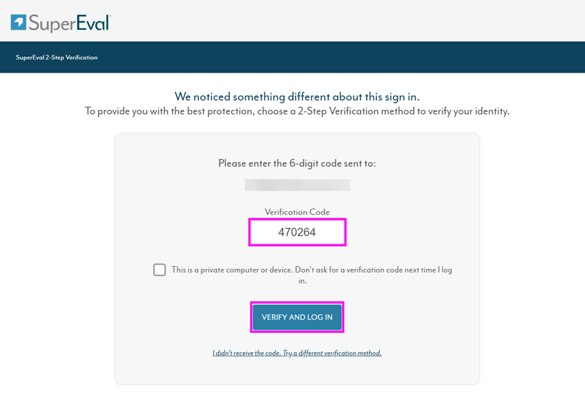 Two-factor authentication adds an extra layer of security to your account and helps protect all SuperEval users’ privacy. You can complete verification using a text message or email depending on your preference and account setup.
