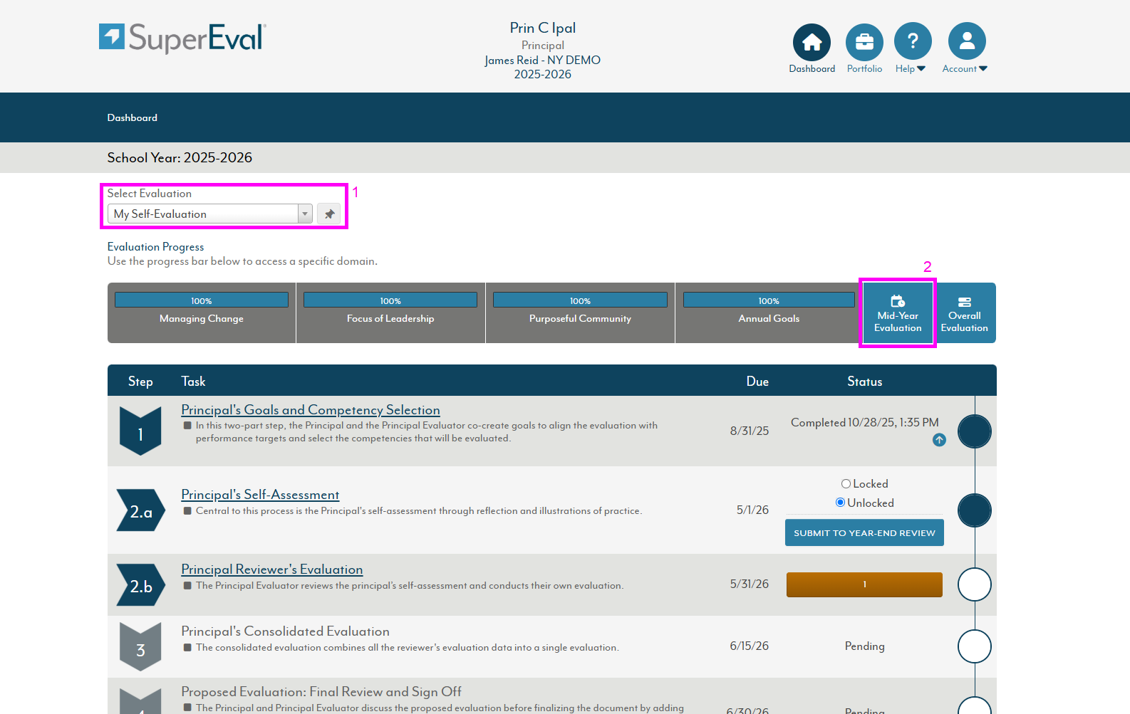 - Click on the Mid-Year Evaluation tab in the Evaluation Progress section.
