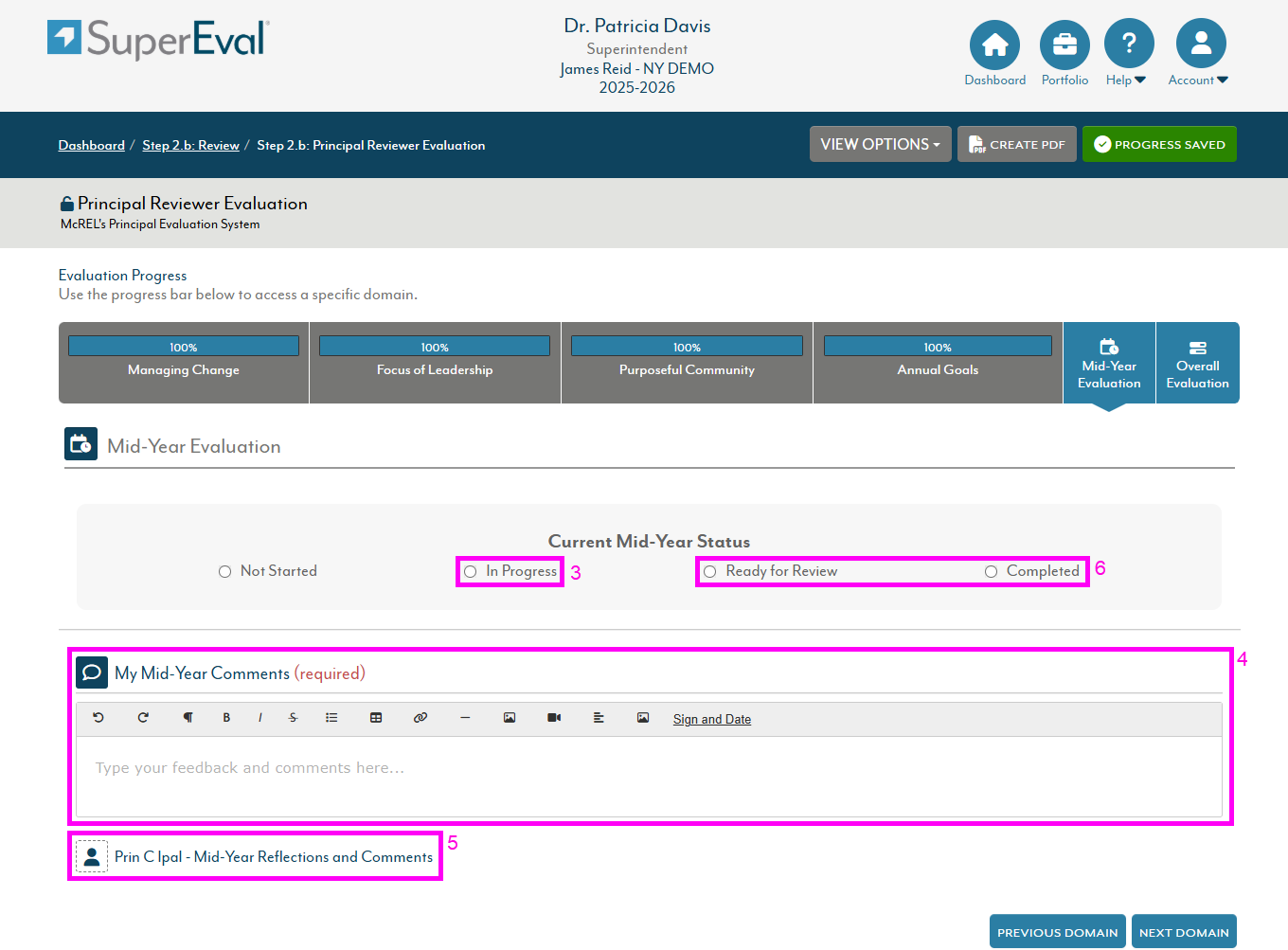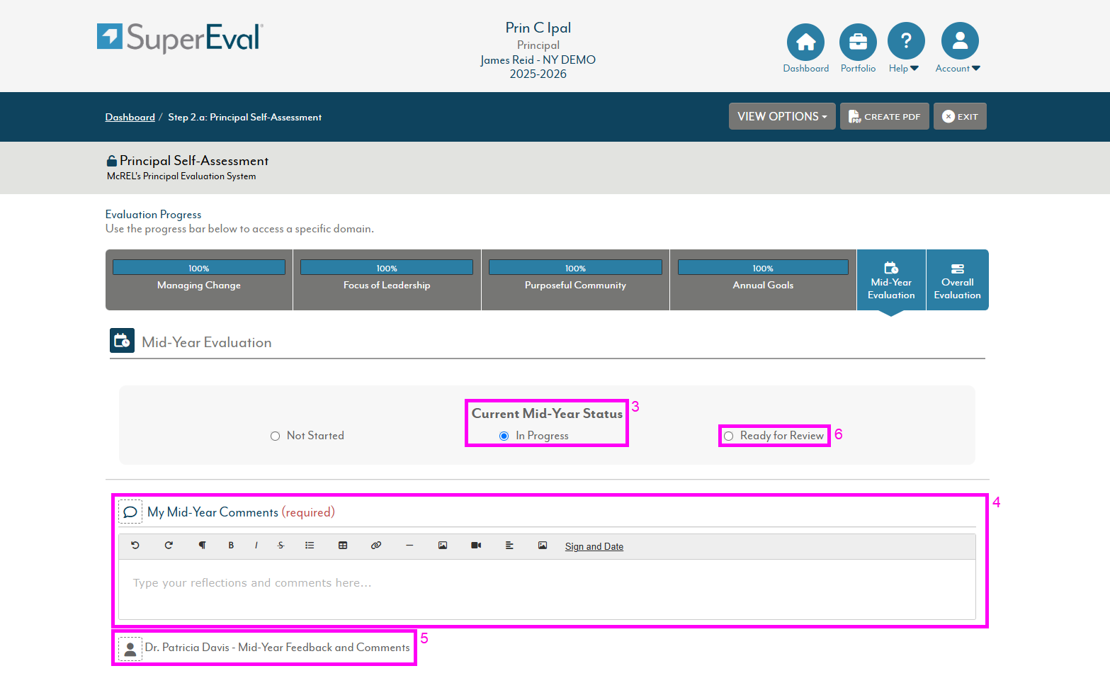 - Fill out the My Mid-Year Comments section with your thoughts and reflections from the mid-point of the school year. This is just a text-based reflection, there are no evaluation responses or evidence submission.