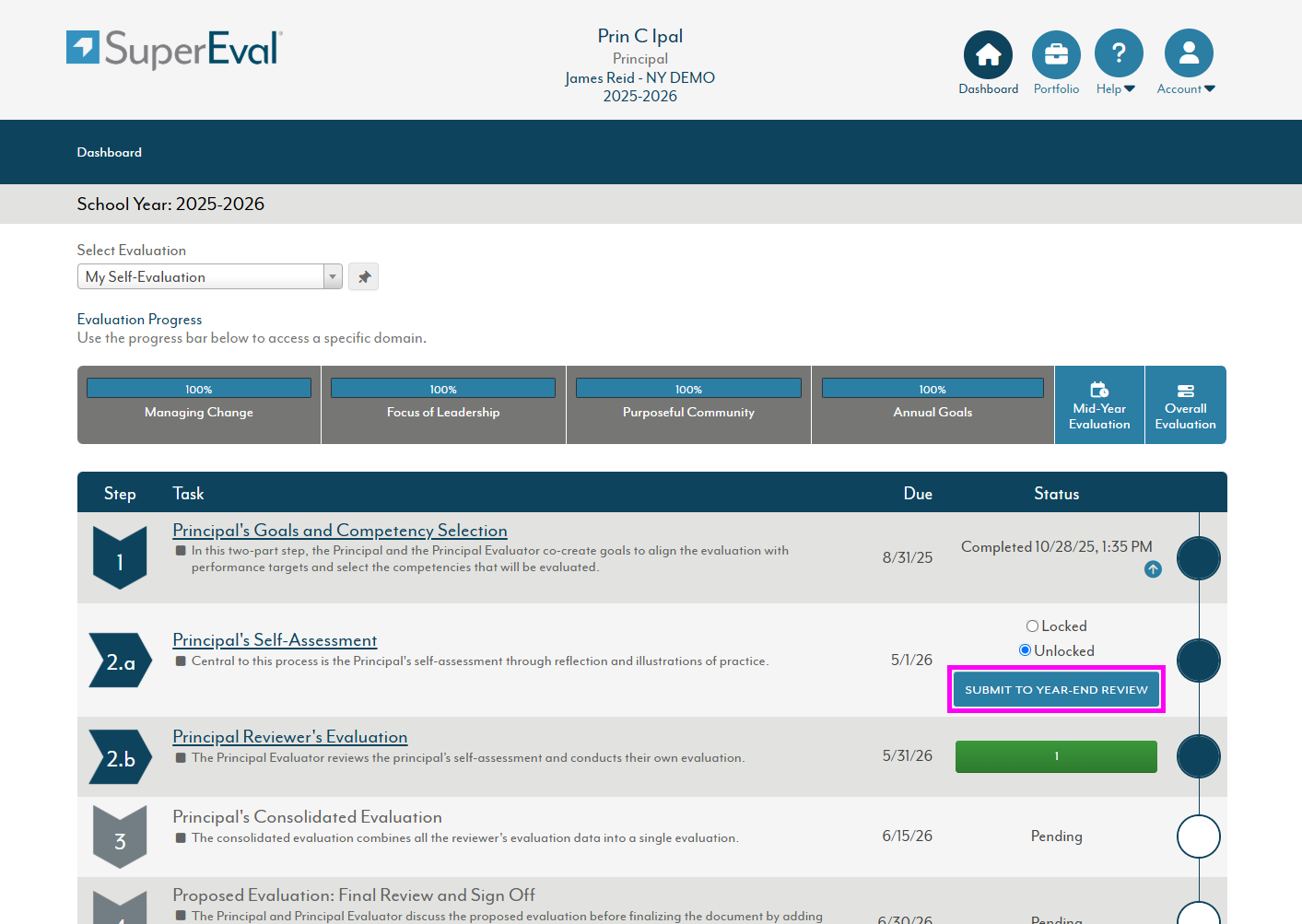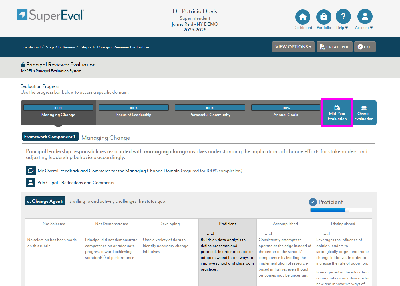 - Confirm that both statuses — evaluatee (In Progress) and evaluator (Mid-Year Review Complete) — are displayed.