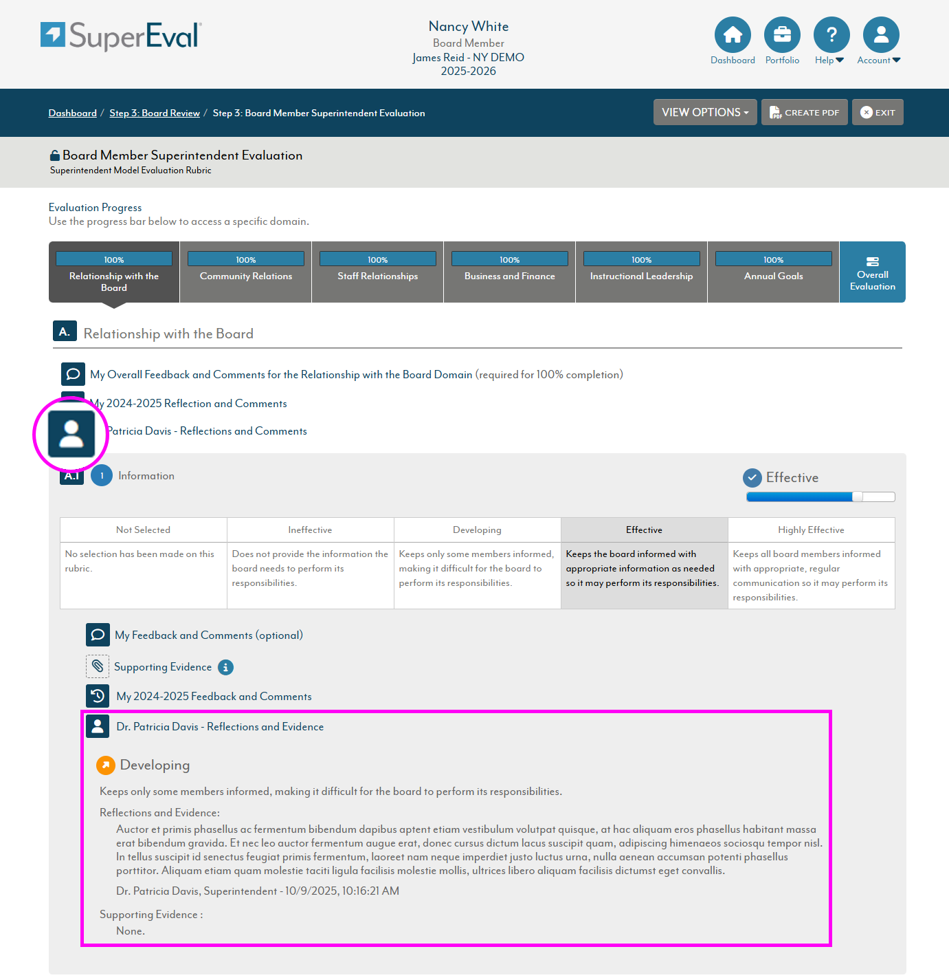 Board Members can view the Superintendent’s self-reflections and comments directly within the evaluation form. This allows evaluators to consider the Superintendent’s input before completing their own ratings and feedback.
