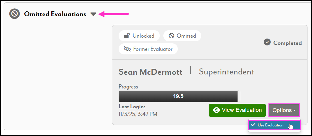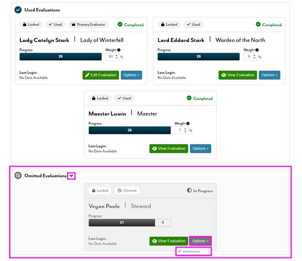 - Used / Omitted - indicates if the evaluator's portion of the evaluation will be included in the data consolidation