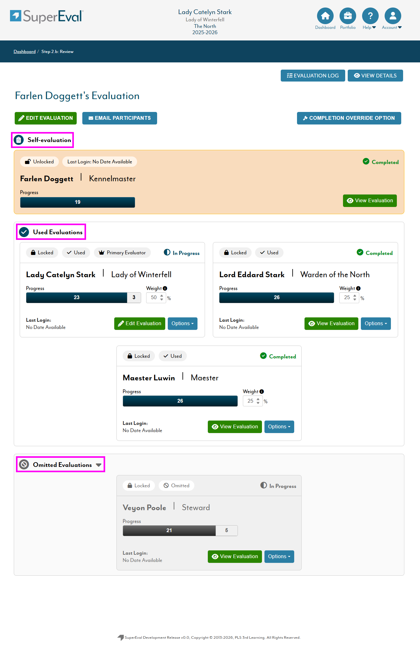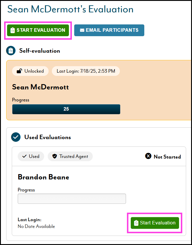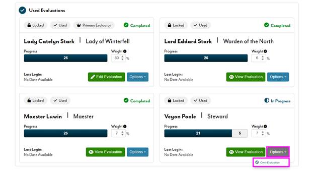 Not Started / In Progress / Completed - indicates the progress status of the evaluation (users can manually mark their portion of the evaluation complete despite not reaching full completion in the progress bar)