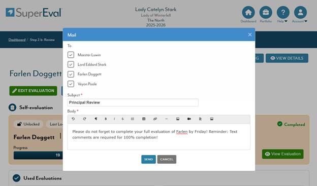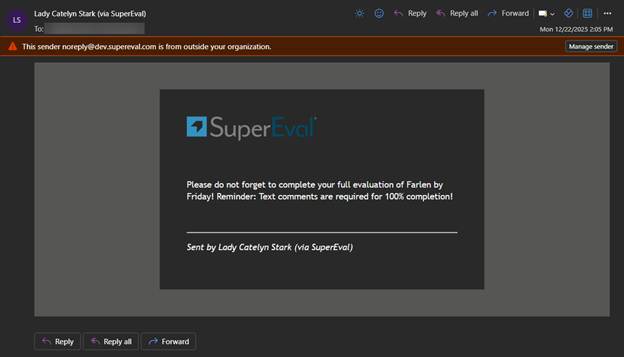 Recipients will receive an email from noreply@supereval.com labeled with your name and signed by you at the bottom:
