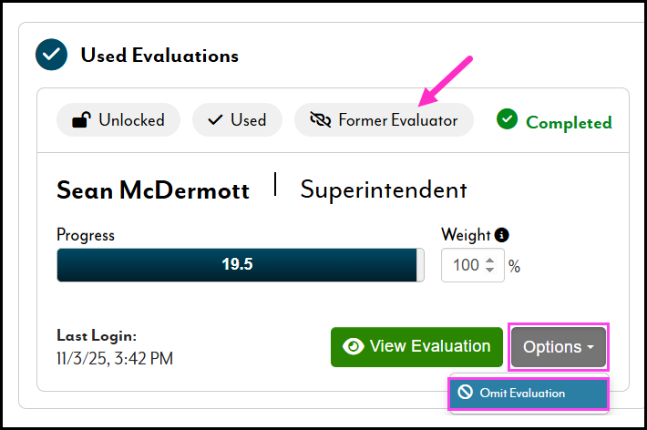 By default, SuperEval will include a previous evaluator's work, which will remain displayed in the new Used Evaluations section. A Former Evaluator label or Deactivated label (if evaluator's account has been disabled) will be present. As the new primary (lead) evaluator, you may opt to exclude the previous evaluator's work from the data consolidation by locating the previous evaluator in the grid view list, clicking Options, and selecting Omit Evaluation. The previous evaluator's ratings and comments will now be omitted from the consolidated evaluation but will remain viewable in Step 2.b. You must then modify the evaluation weight accordingly for the remaining evaluator(s) (see Weighing Evaluations for more information).
