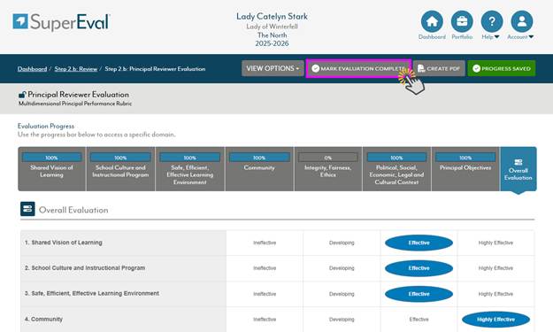 To indicate that you have finished your portion of the evaluation, click the Mark Evaluation Complete button along the top of the screen.