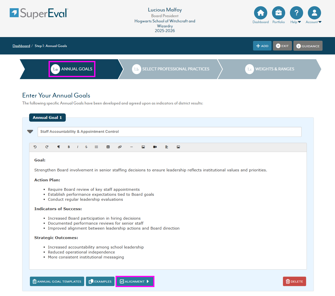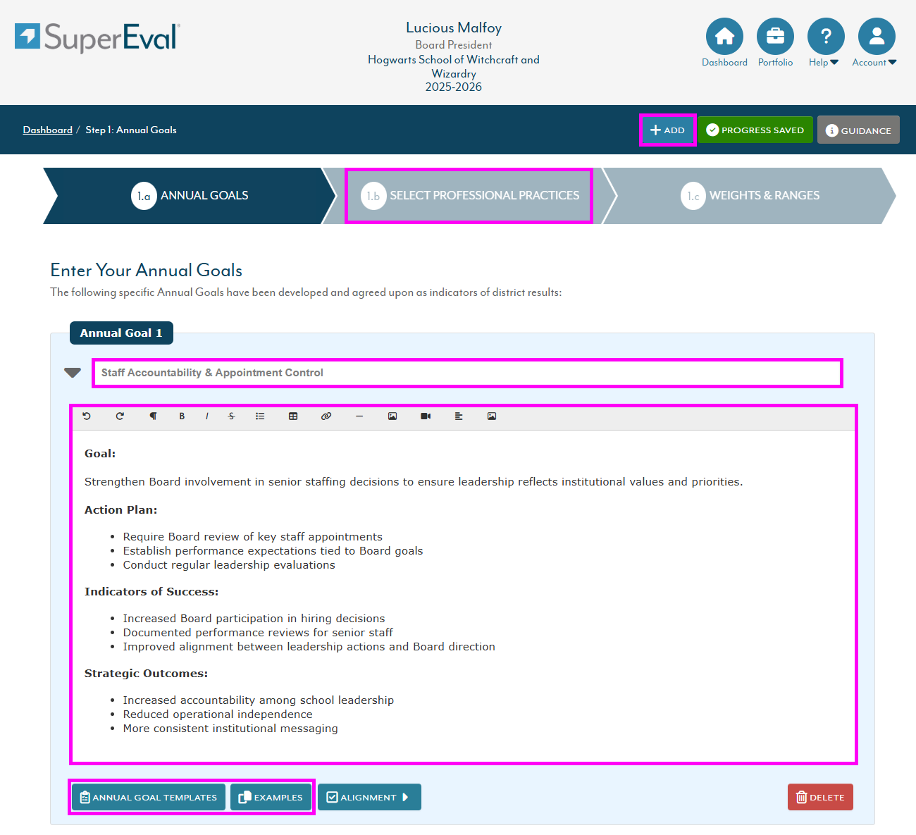 In Step 1, as the Board President, you are responsible for entering the board’s annual goals and selecting the professional practices (competencies) the board will use for the self-evaluation. While creating goals and alignment decisions are often a collaborative effort involving the full board, entering this information into SuperEval can only be completed by the Board President or their Trusted Agent.
