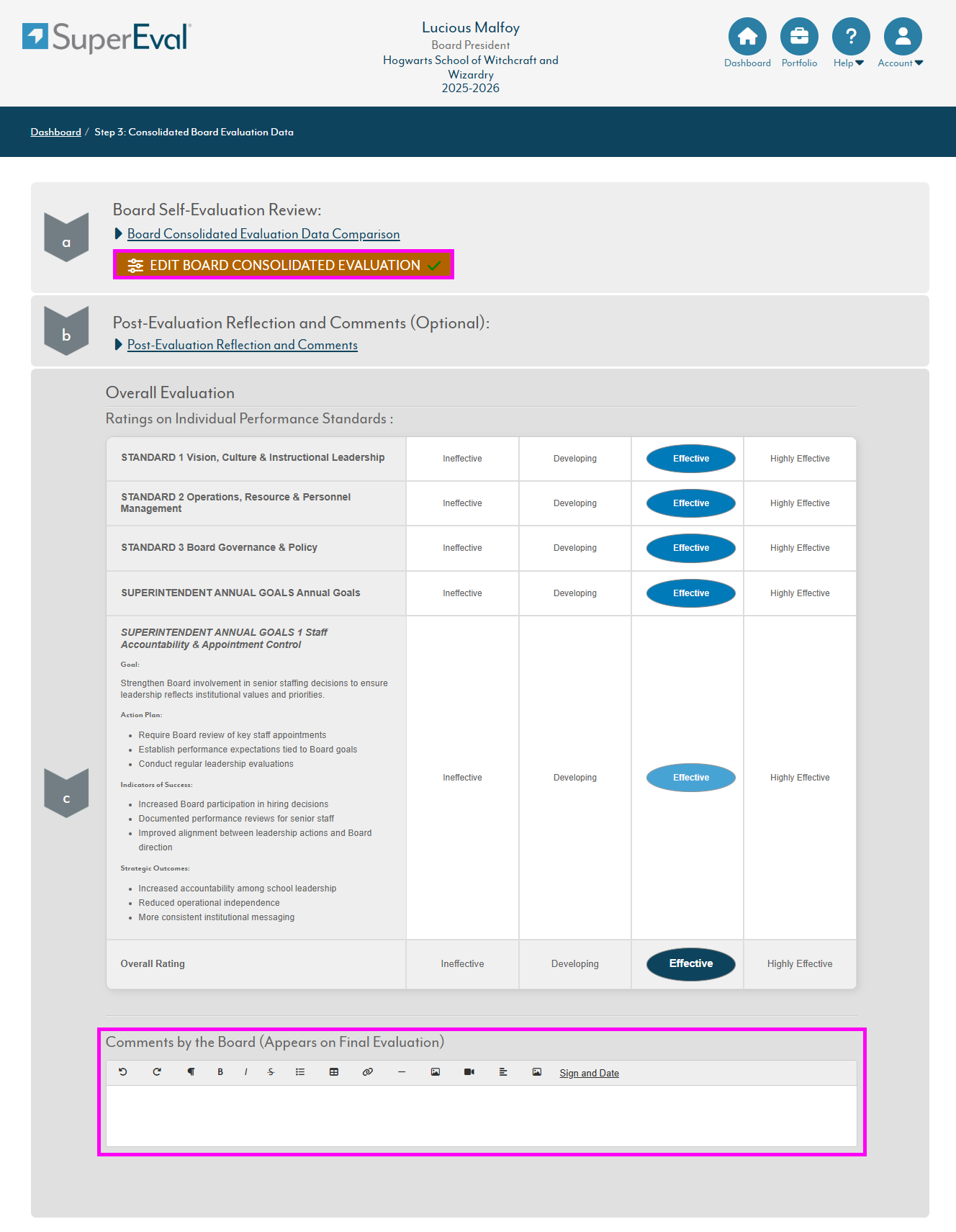 Lastly, if there are any final comments that the board would like to be included on the final evaluation summary document, scroll down and enter them in the box titled Comments by the Board (Appears on Final Evaluation).
