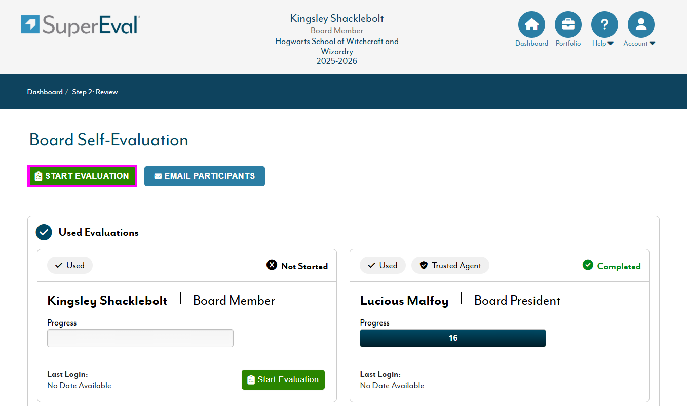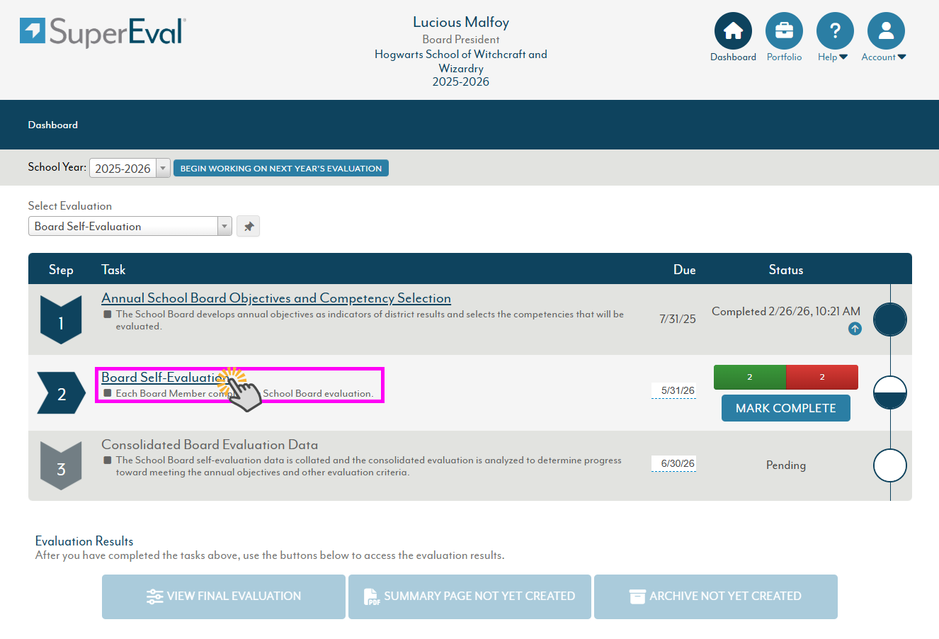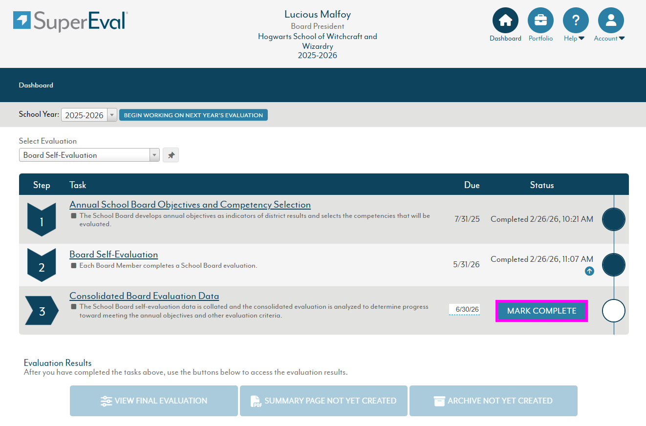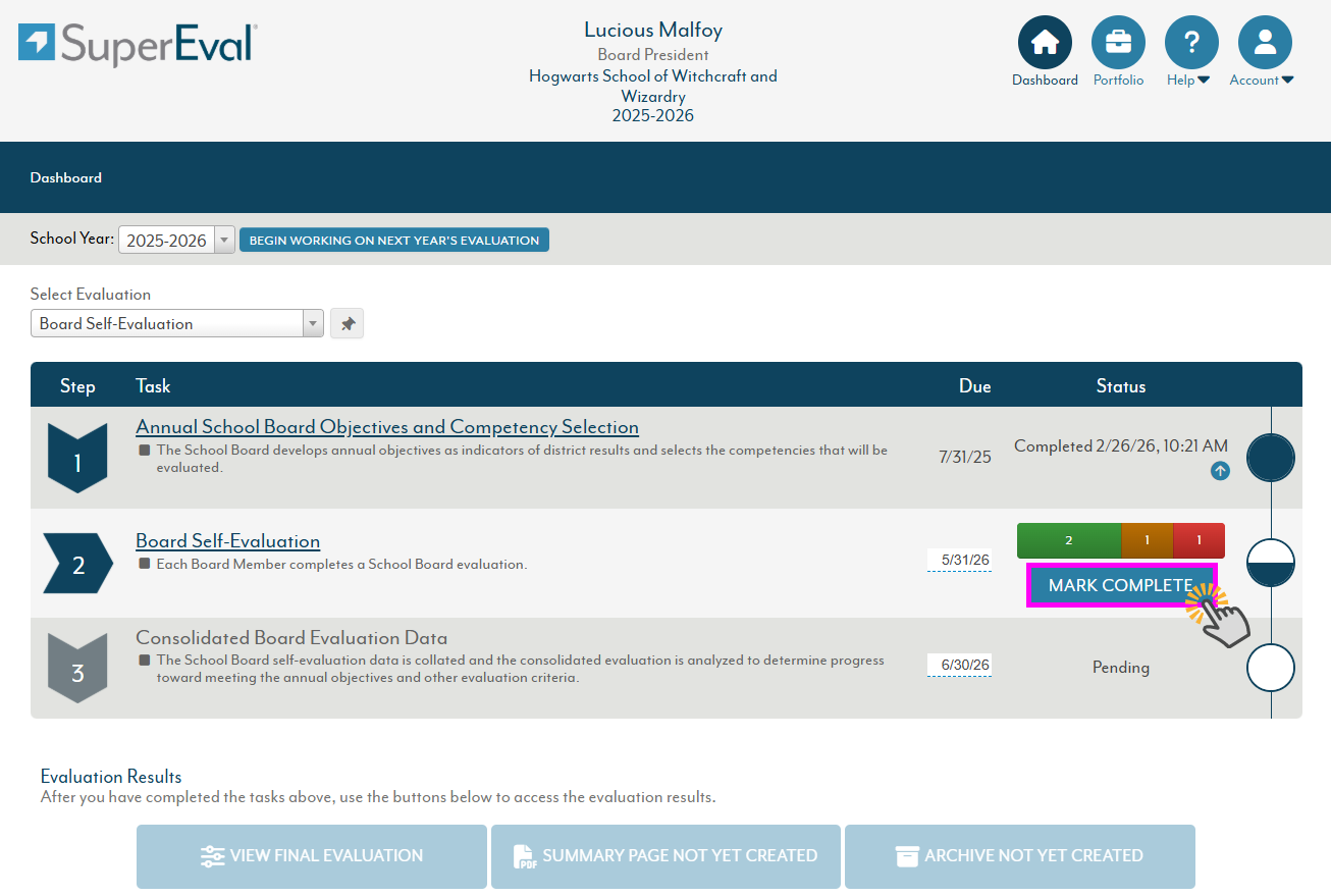 Once everyone has completed their evaluation, go to the Dashboard and click Mark Complete on Step 2.