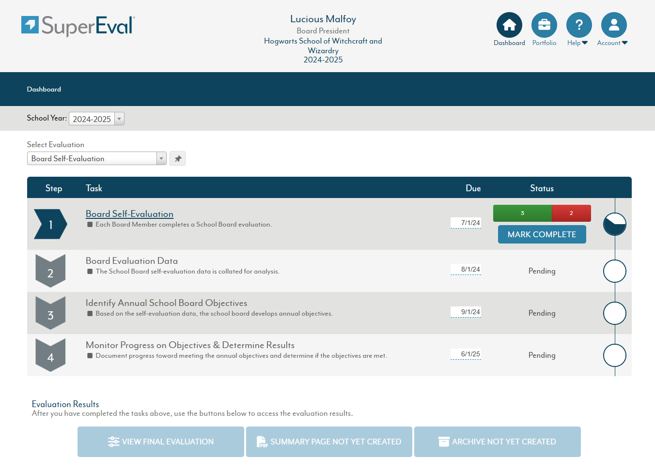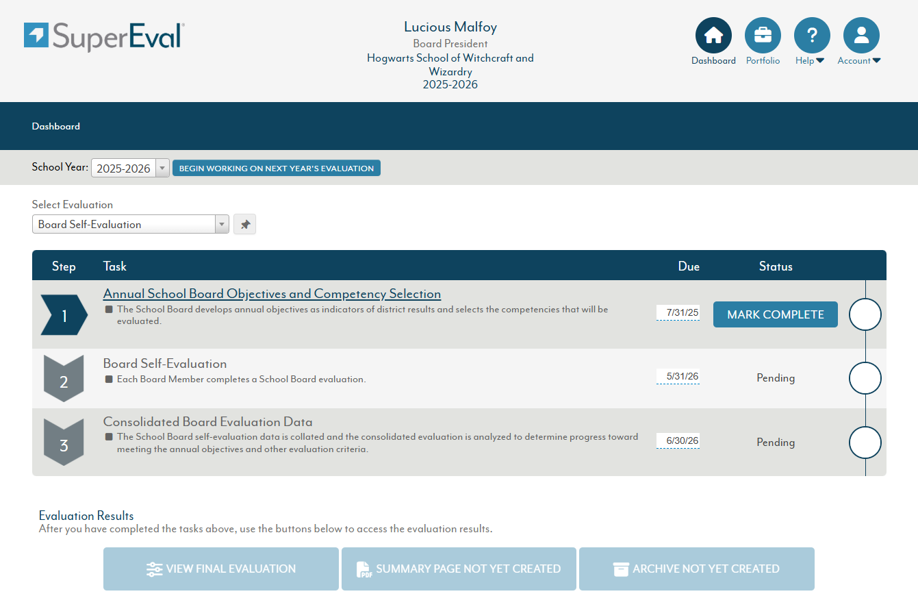In Step 4, the Board President rates the board's performance and progress toward these goals and finalizes the evaluation.