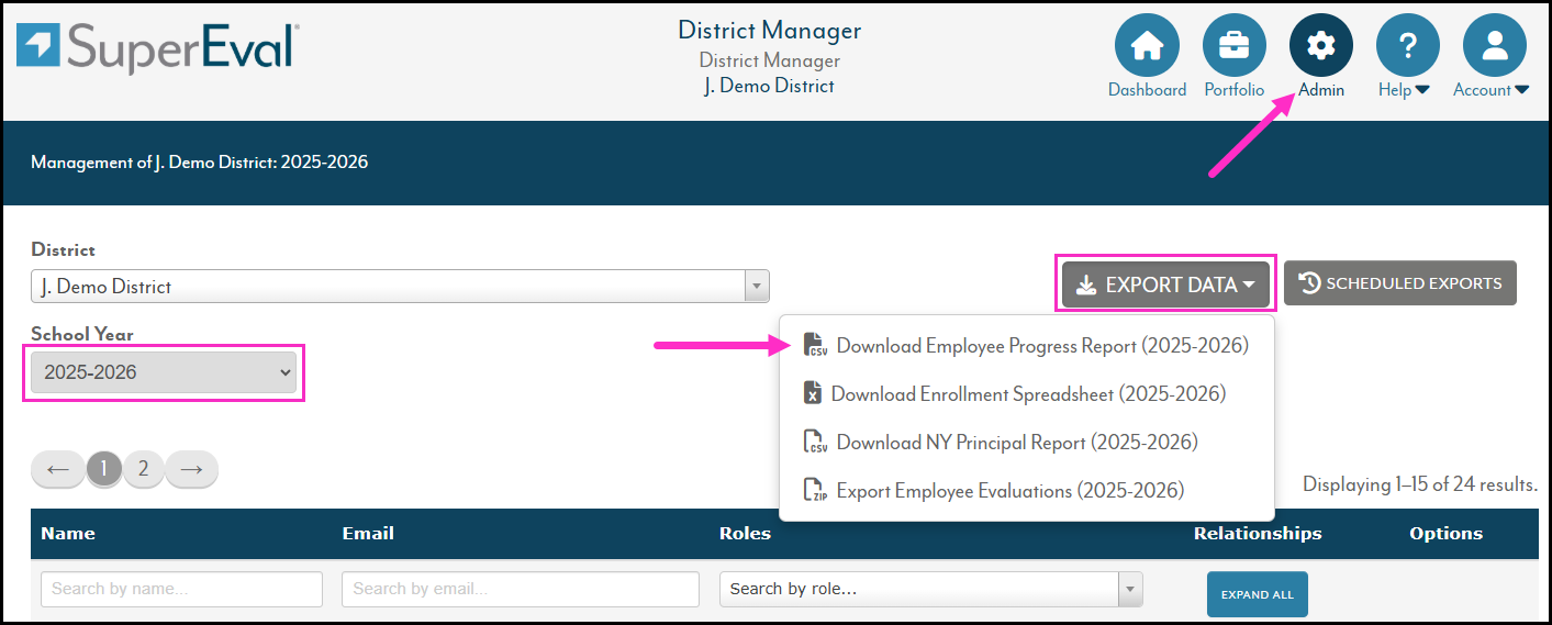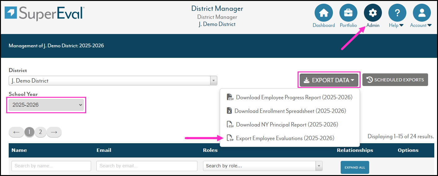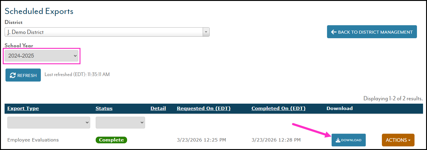 Users with the District Manager Role can export all completed evaluations for a given school year for non-board-evaluated employees (i.e., administrators, principals, etc.).