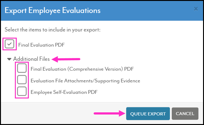 - Select the items you wish to include in the export by checking the applicable boxes (the Final Evaluation [Signatures] PDF is automatically selected for you but you may deselect it) - click Additional Files to view the other options